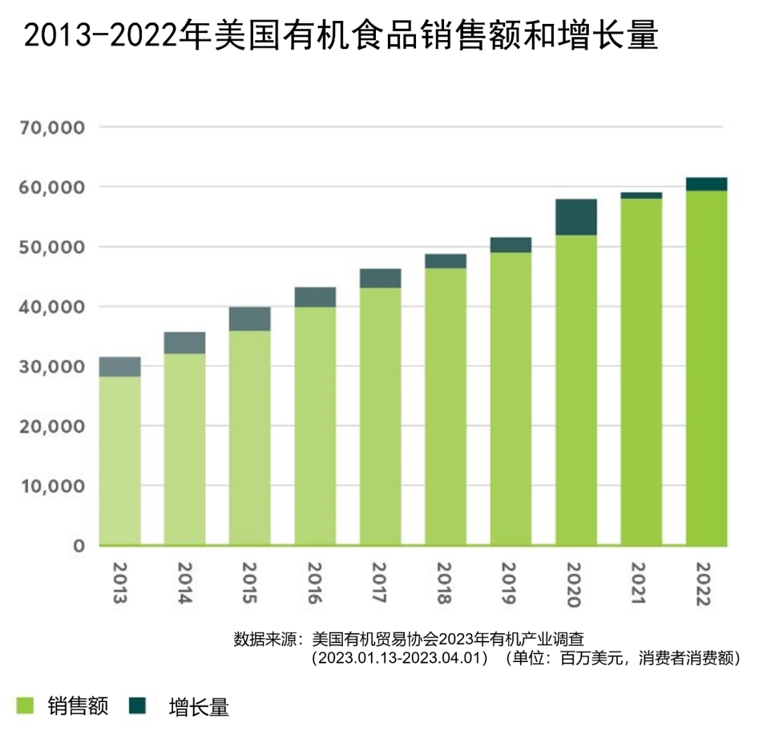 2022年美國的有機食品銷售額首次突破600億美元,為富有活力的有機行業(yè)創(chuàng)下另一個高水平的標志。根據美國有機貿易協(xié)會本周三(5月10日)發(fā)布的2023年有機行業(yè)調查報告,美國有機銷售總額(包括有機非食品產品)達到創(chuàng)紀錄的676億美元。